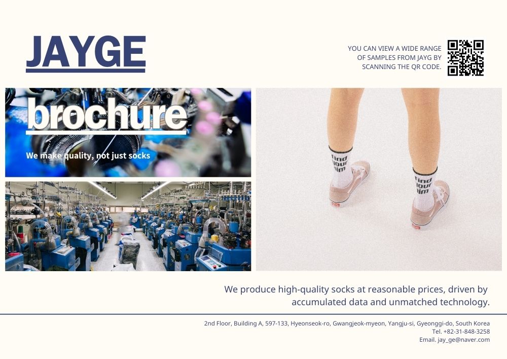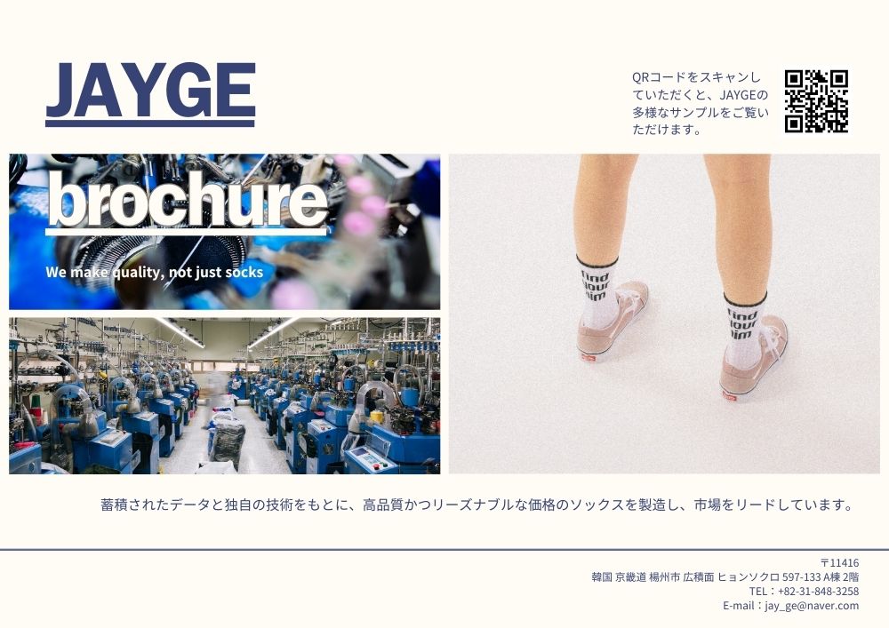 제이지 양말 공장의 생산 역량과 제작 과정, 직접생산확인증명서를 포함한 주요 서류를 정리한 브로슈어입니다.